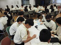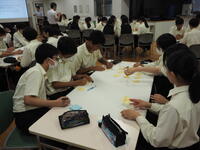 夕食の後は、今年90才になられるという語り部の方からの、平和講和でした。10歳の時に、家族と離れ離れになり、死ぬ時は痛くないように一気に死なせてください、と念仏のように唱えながら、沖縄の地をさまよったというお話は、胸にせまるものがありました。あきらめない、命を大切に、戦争は絶対だめ、平和を保つのが私たちの世代の役目、など心に残る言葉がたくさんありました。みんな、一生懸命、メモをとりながら話しをきいていました。自分たちができることについて、考えることができたと思います。