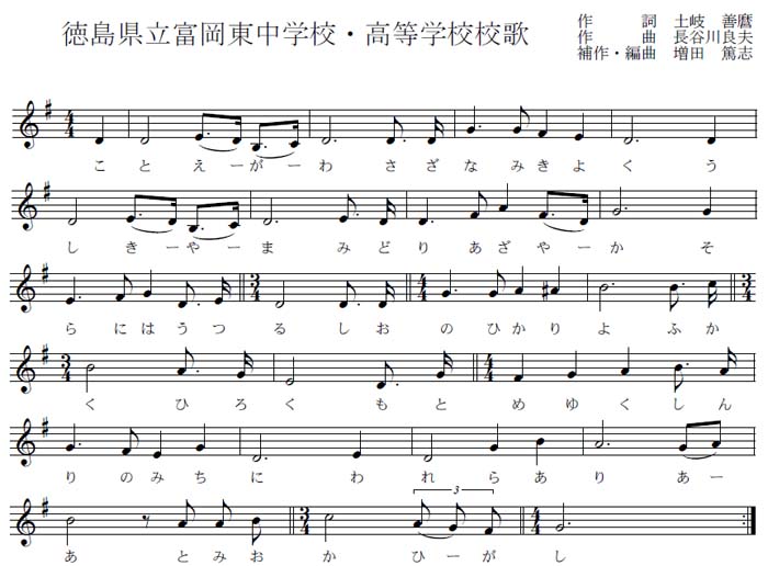 富岡東中学校開校に伴い,歌詞の「富岡東高校」を「ああ 富岡東」に変更しました。